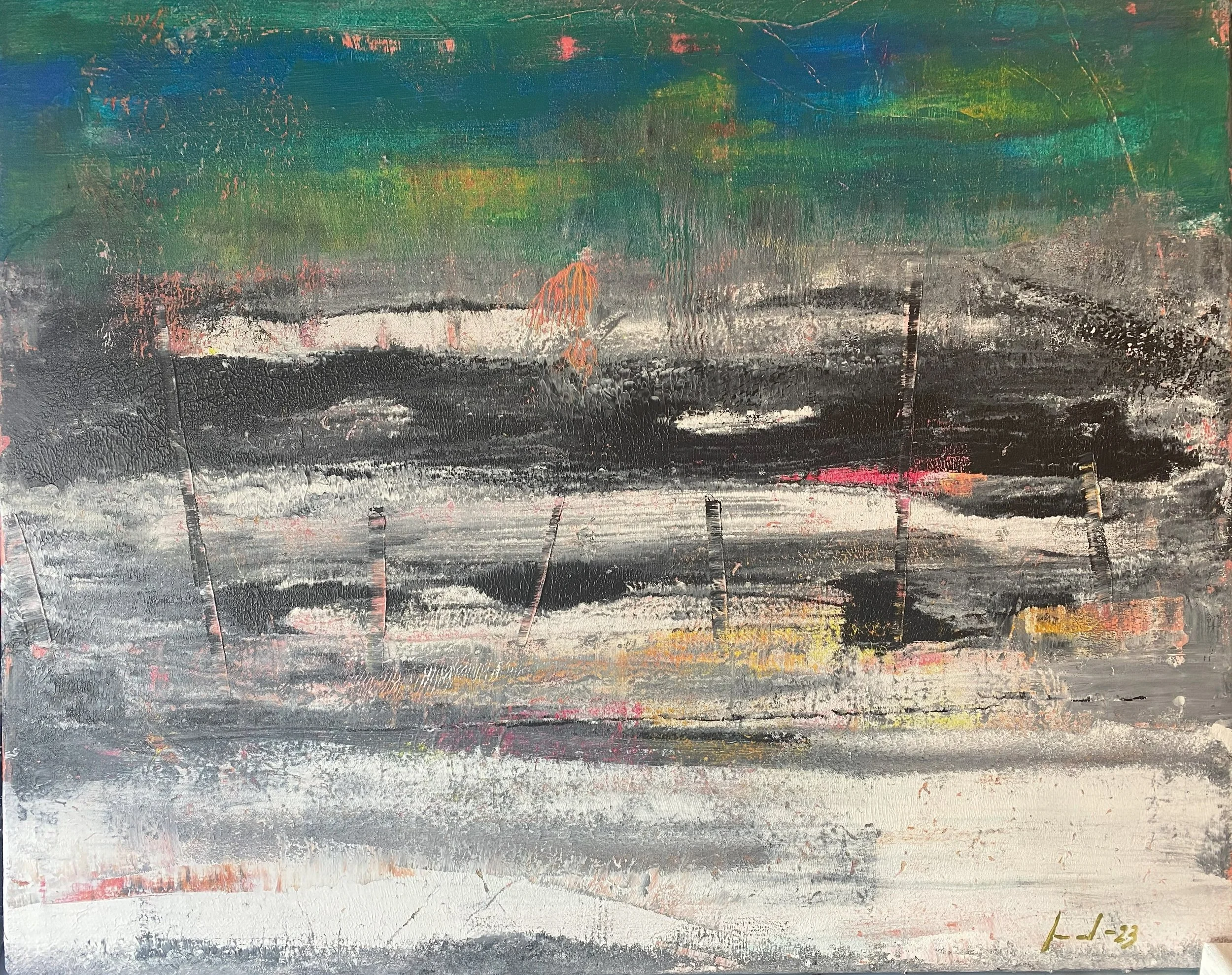 Dette maleriet skildrer en abstrakt landskapsscene i en dempet og mystisk fargeskala. Øvre del domineres av grønne og blå toner som kan minne om en himmel, mens midten og nedre del har grå og hvite nyanser med subtile innslag av rosa og gult. Maleriet har en teksturert overflate, og vertikale linjer kan tolkes som stiliserte trær eller stolper som strekker seg oppover. Det gir en følelse av ro med et snev av melankoli og naturens råskap.