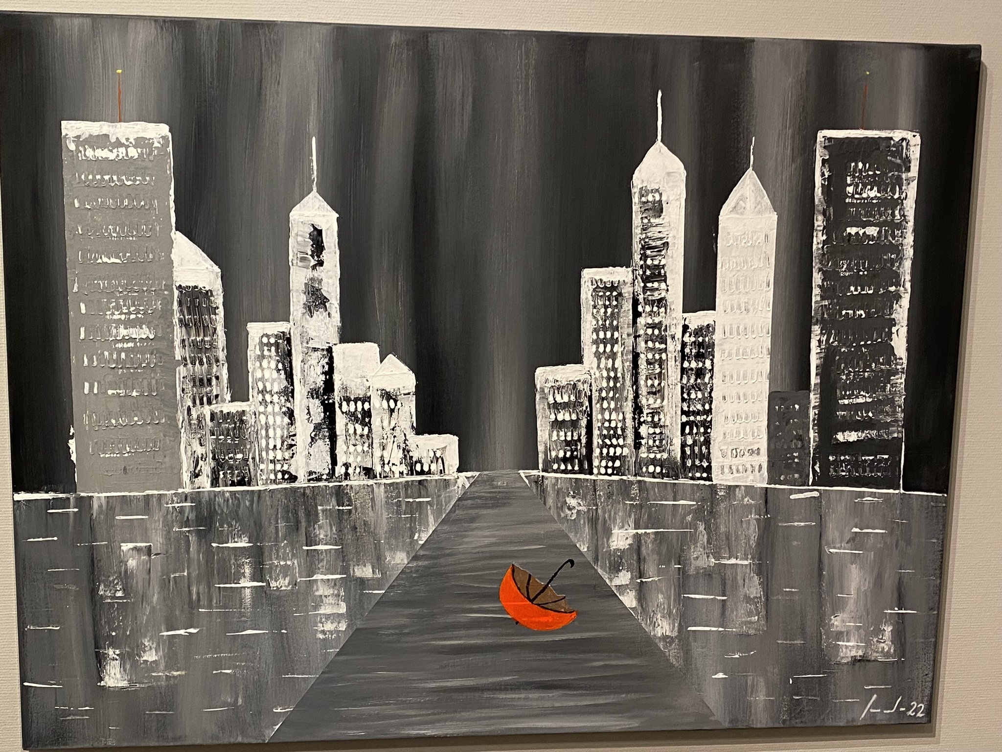 Dette maleriet viser en stilisert byscene i svart-hvitt, med høye skyskrapere speilvendt i en våt eller reflekterende overflate. Bygningene er malt med grove, teksturrike penselstrøk og fremstår som monumentale og geometriske mot en mørk, regntung himmel. Midt i det symmetriske og monokrome bybildet skaper en liten, rød paraply som flyter på vannet en sterk kontrast – et blikkfang som tilfører både farge og følelse. Maleriet uttrykker en melankolsk, men poetisk stemning, og spiller på kontraster mellom menneskelig sårbarhet og storbyens monumentalitet.