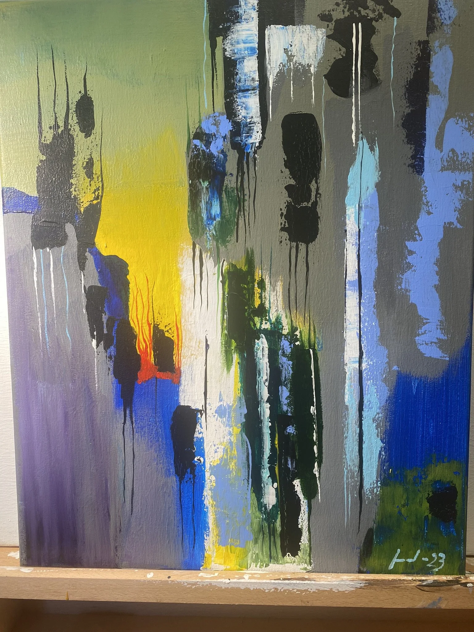 Dette maleriet er et abstrakt verk preget av en rik og variert fargepalett som inkluderer grønne, blå, gule og svarte toner. Vertikale linjer og drypp skaper en følelse av bevegelse og dybde, mens overgangen mellom sterke og dempede farger gir maleriet en balansert, men dynamisk atmosfære. Komposisjonen har en spontanitet som inviterer til fri tolkning, og kan assosieres med naturens uforutsigbare skjønnhet eller urbane strukturer.
