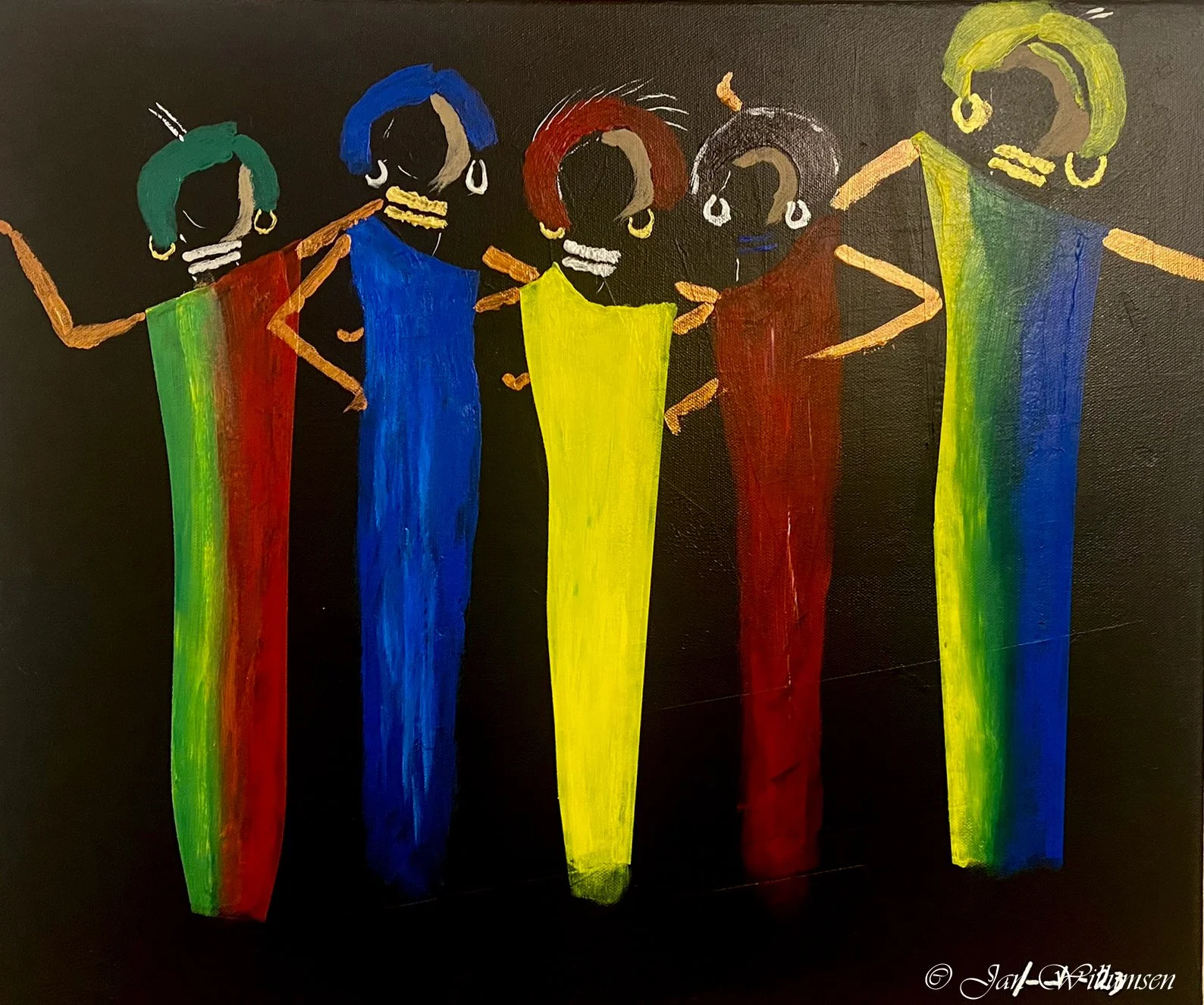 Dette maleriet skildrer fem stiliserte figurer i sterke primær- og sekundærfarger mot en dyp svart bakgrunn. Figurene er avlange og abstrakte, med fokus på deres bevegelser og samspill. Hver figur har individuelle farger og detaljer som gjenspeiler personlighet og mangfold. De gyldne smykkene og de hvite halsringene tilfører et etnisk preg, mens kroppsspråket formidler en følelse av fellesskap og glede.