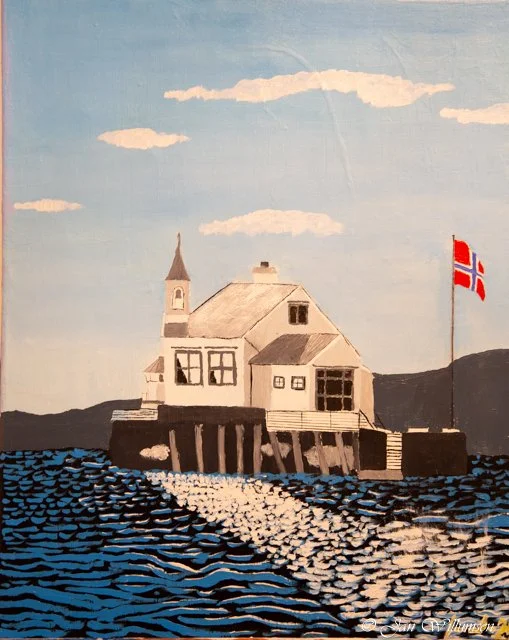 Dette maleriet viser Dyna Fyr, et ikonisk sjømerke i Oslofjorden, malt i en stilisert og grafisk stil. Fyrbygningen, med sitt karakteristiske spir og hvite fasade, står på påler over det bølgende blå havet. Den norske flaggstangen på høyre side gir bildet en nasjonal stemning. Skyene i den lyseblå himmelen og skyggeeffektene på vannet fremhever dybde og bevegelse. Kunstverket fanger fyrens historiske betydning og rolige plassering midt i fjorden.